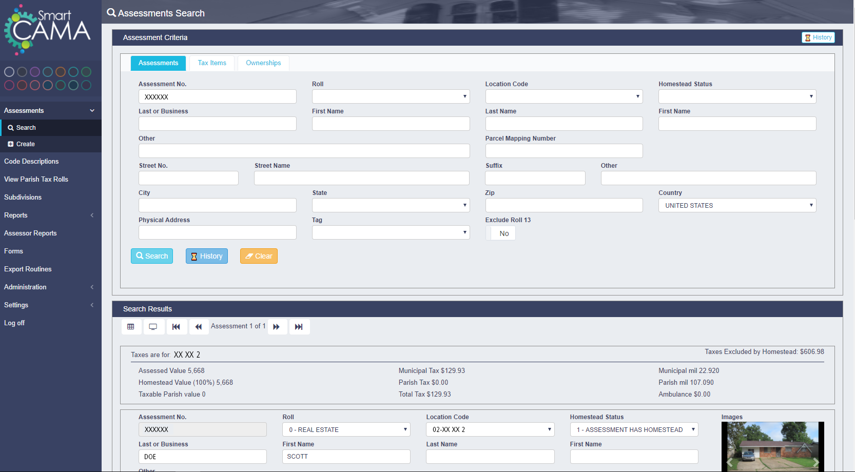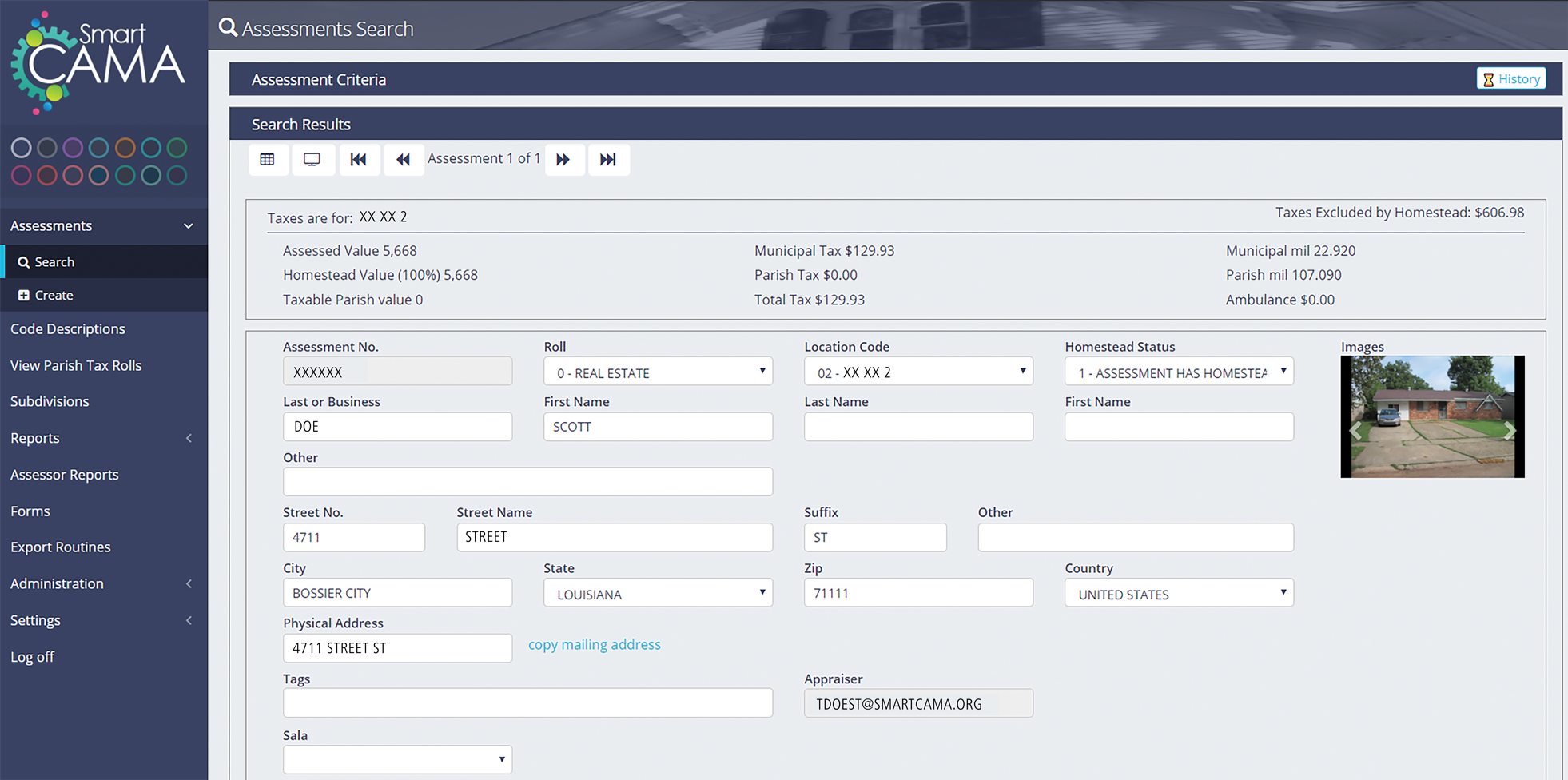 In the search results window, the administrator can view immediately at the top, all taxes for this assessment including assessed value, municipal tax, municipal mil, taxes excluded by homestead exemption, and total tax amount. The search results also show all the information about the property including name of owner, location, location code, and appraiser. If available, there will also be an images of the property. If there are multiple assessment in the results, the administrator can move between them using the navigation tools at the top of the results window.