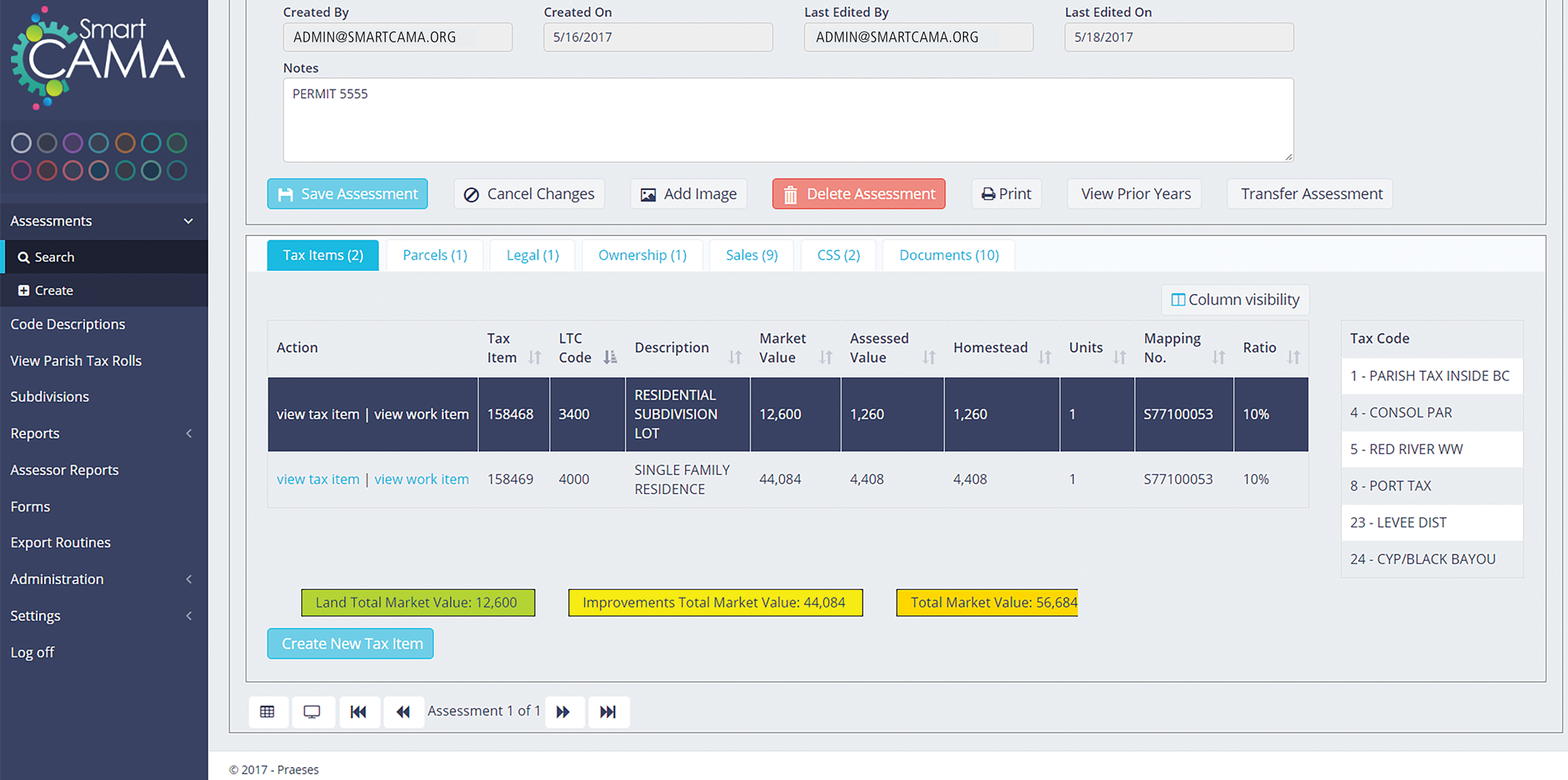 Learn More - REQUEST A DEMO!In SmartCAMA, the administrator can drill down even further to see more details about the assessment and can the edit those details. In this window, images can be added, and information added or edited. Tax items can be added or deleted here. Also, parcels, legal docs, sales, and ownership can be viewed and edited. There is also a notes section at the top, allowing the administrator to add items like permit numbers.