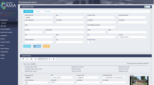 Once in the SmartCAMA tool, the administrator can set up Search Criteria, allowing them to find any assessment based on assessment number, location, last or business name, parcel mapping number, street address, or physical address. The admin can also clear the search criteria and start again or look at the search history to see if this search has been conducted at another time. The search results will show up below and then the search criteria can be hidden so the administrator can work directly with the search results.